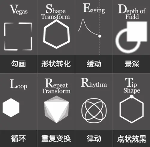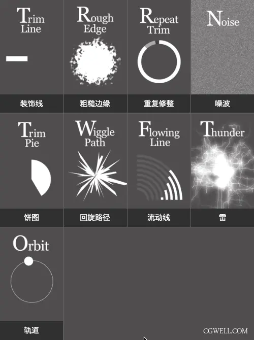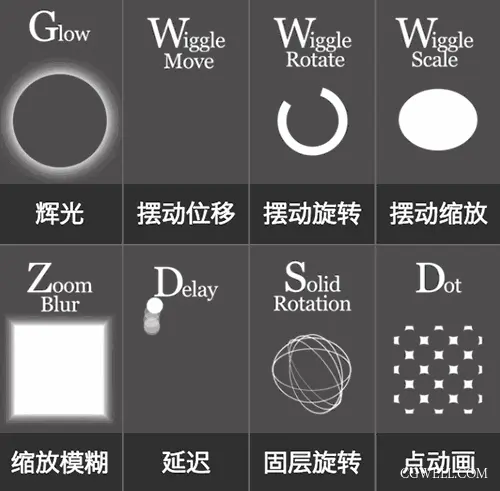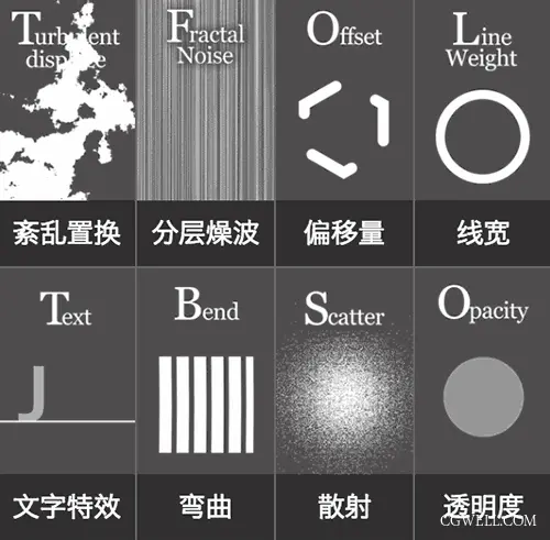 | 湍流置换/紊乱置换 | 很多种变化效果,静态的;要动起来的话,依赖关键帧;演化属性表示复杂度 |
