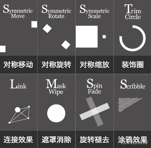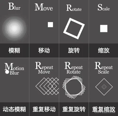 | 旋转扭曲 | 字面意思,类似旋涡一样的旋转扭曲,合理利用旋转扭曲中心进行关键帧设定可以产生飘动的效果 |